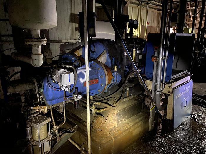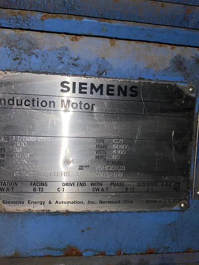 Used Ingersoll-Rand Model 1CV8M2 air compressor. Intake capacity 726 SCFM, Intake pressure 14.396 PSIA, Discharge pressure 125 PSIG, Rated speed 3575 RPM. Intake temp 115 degrees F, S/N C11999. Powered by Siemens 300 HP 3/60/4160 volt Induction motor 3576 RPM. Has operator interface control panel. Built 2006. FOB: Wilmington, NC